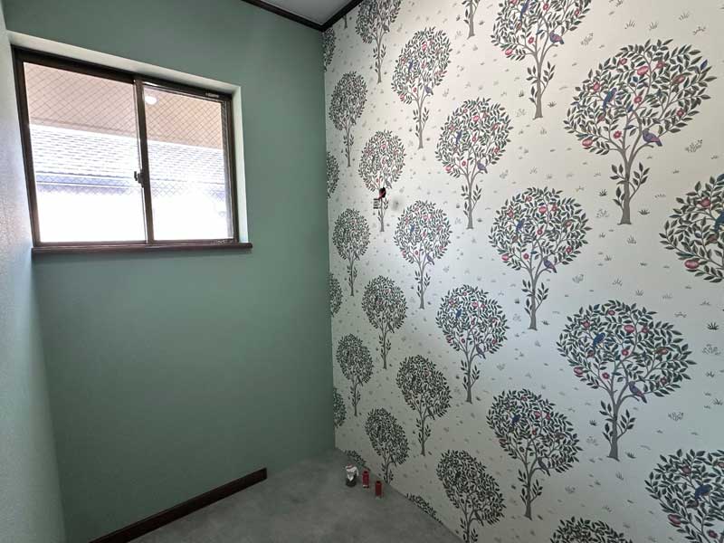窓からの自然光と壁紙の組み合わせが、明るく心地よい雰囲気を作り出しています。