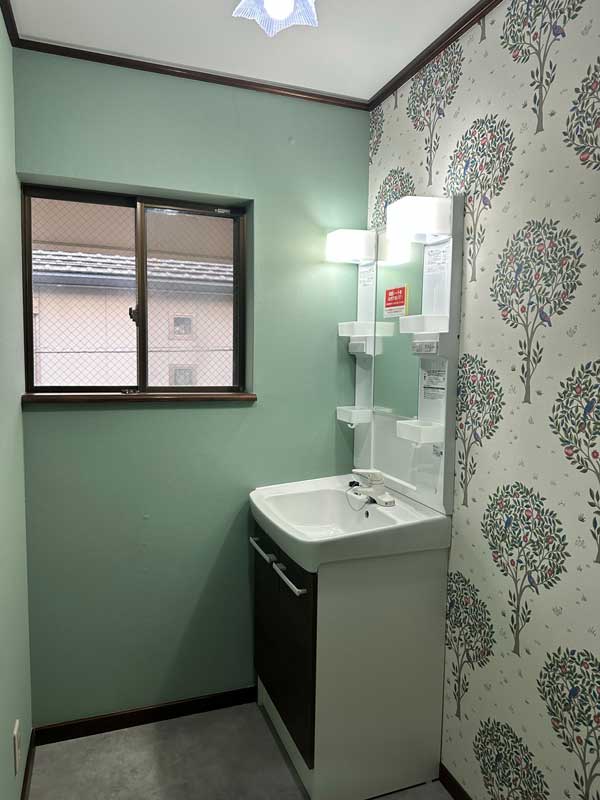 新たに洗面化粧台を設置し、アクセントクロスを使用することで、魅力的なプライベート空間になりました。